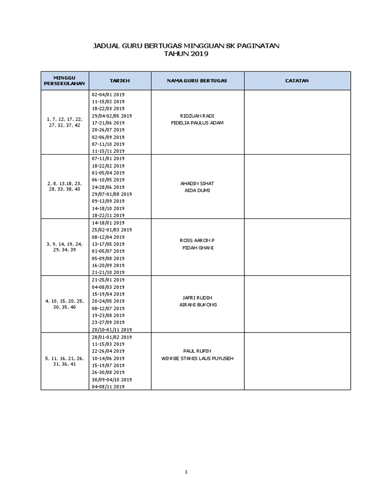 Jadual Guru Bertugas Mingguan 2019